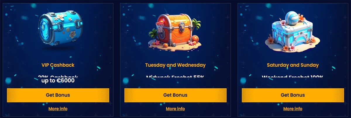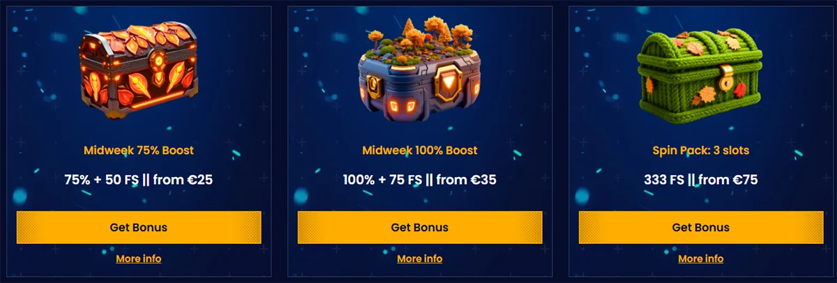 Weekend Reload Bonus piedāvā 150% bonusu līdz €300 katru nedēļas nogali. Trešdienās aktivizējam Wednesday Bonus - 50% līdz €300 plus 50 bezmaksas griezienus.